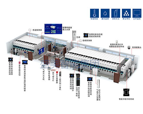 檔案庫房一體化管理總臺 檔案庫房環控管理系統 RFID檔案管理系統 檔案庫房密集架 檔案庫房安防管理系統 檔案庫房消防管理系統 檔案庫房漏水監測子系統 檔案除塵凈化消毒設備 智能檔案選層回轉柜